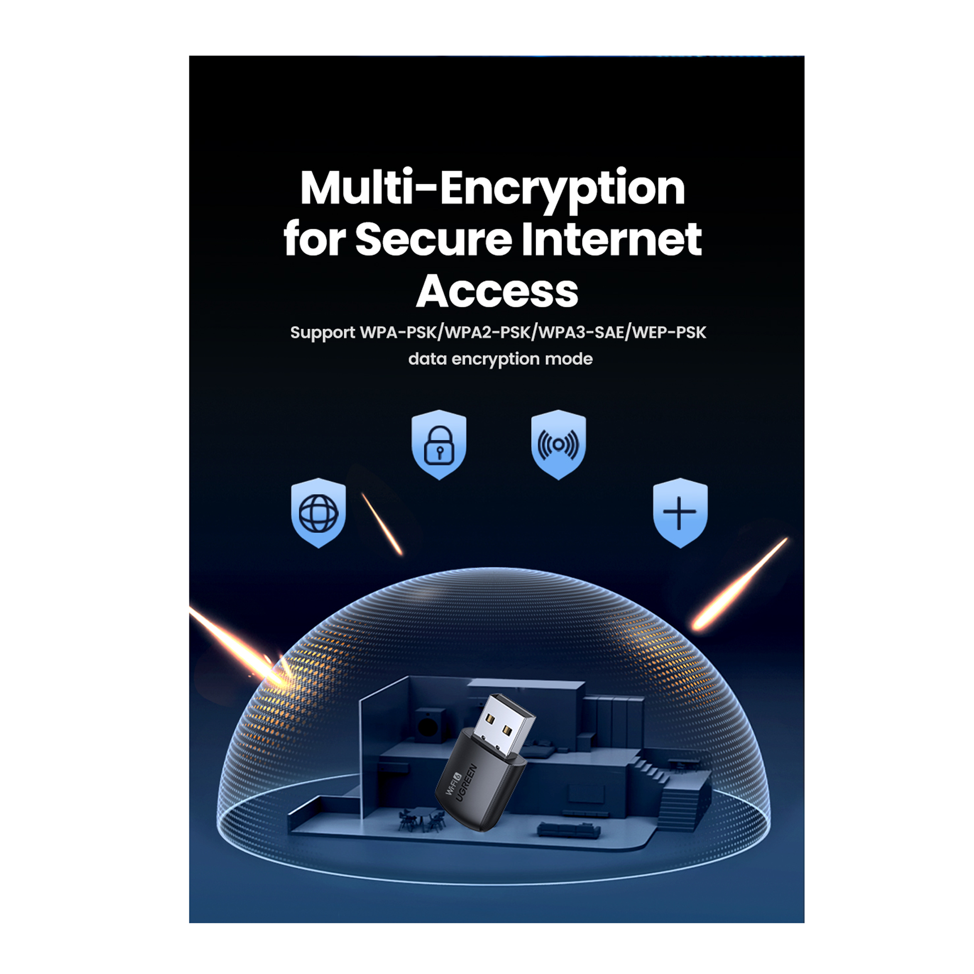 - Encryption: WPA-PSK / WPA2-PSK / WPA3-SAE / WEP-PSK