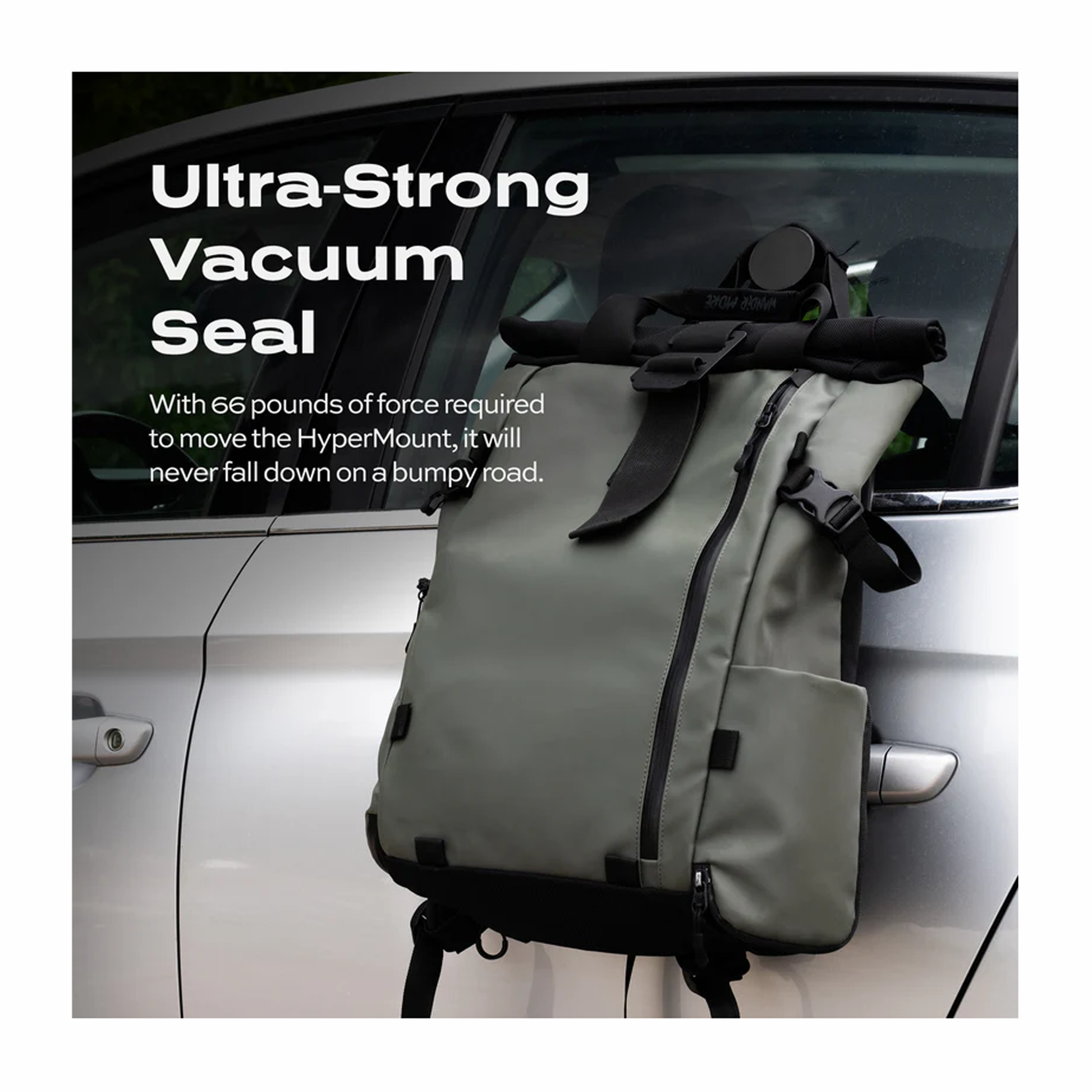 - Ultra-Strong Vacuum Seal. With 66 pounds of force required to move the HyperMount, it will never fall down on a bumpy road.
